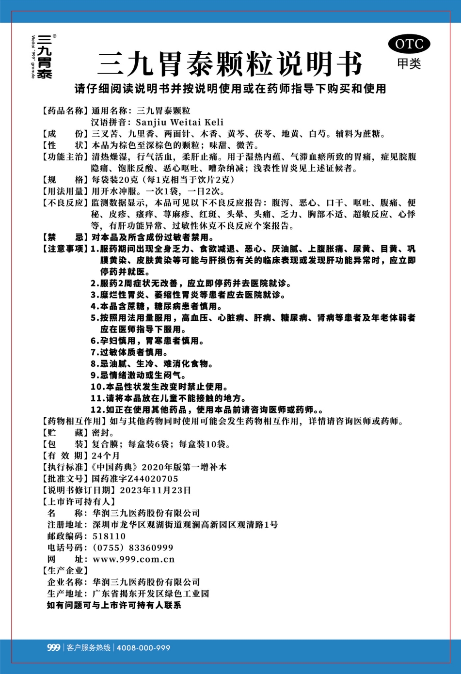 三九胃泰颗粒20g说明书[揭阳厂外2401版]